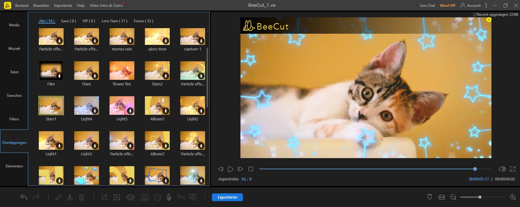 Zolang je werkt aan het project, sla je het bestand op als een .ve-bestand. Het resultaat is te exporteren in mp4-, avi-, wmv-, mkv-, mov -en gif-formaat. Het is zelfs mogelijk om het audiobestand afzonderlijk weg te schrijven. Door op het tandwieltje te klikken zijn de resolutie, framesnelheid en bitrate handmatig aan te passen. Af en toe verwijst het programma naar het vip-abonnement waarin je nog aan een hogere kwaliteit kunt opslaan. Daarmee bedoelt BeeCut het betaalde abonnement in plaats van de testversie.