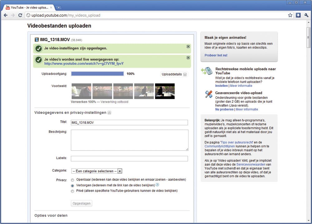 Het uploaden van de video’s kan even duren, afhankelijk van de uploadsnelheid van uw verbinding. Na het uploaden moet YouTube de video’s ook nog even verwerken, waarna u echt aan de slag kunt.