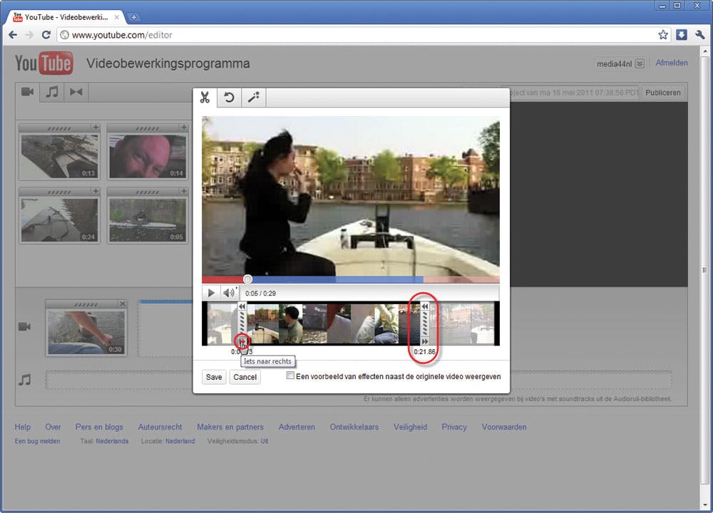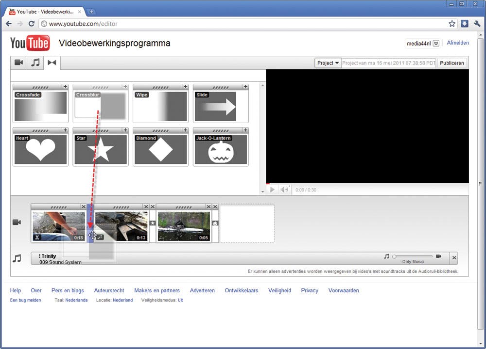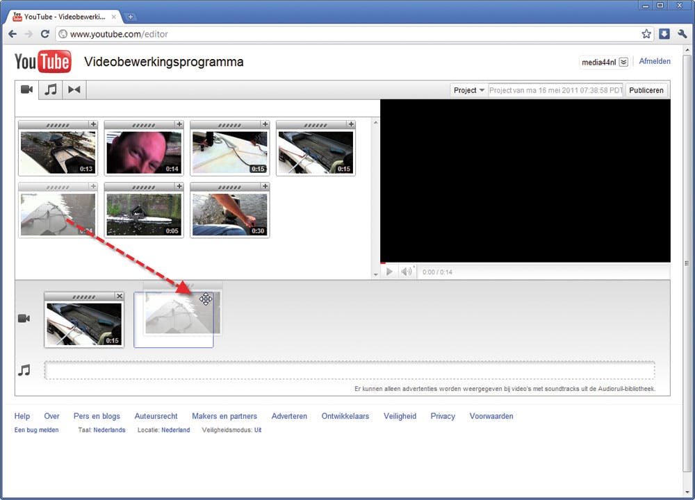 Ga naar www.youtube.com/editor. Als het goed is, ziet u de door u geüploade video’s nu als miniaturen verschijnen. Als u de muiscursor over een miniatuur beweegt, ziet u dat de cursor verandert in een vierwegspijl, wat aangeeft dat u de video kunt verslepen. Pak een video op door de linkermuisknop ingedrukt te houden en versleep de videominiatuur naar de witte rechthoek met stippellijn op de tijdlijn. Als de stippellijn verandert in een blauwe lijn, kunt u de linkermuisknop loslaten. Zo eenvoudig werkt het! Is de volgorde niet naar uw zin, dan kunt u de videofragmenten net zo gemakkelijk verplaatsen.