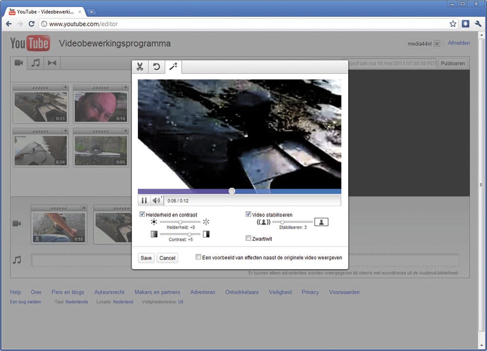 Het knopje om de video te draaien is bedoeld voor het rechtzetten van eventuele rechtopstaande of ondersteboven gefilmde video’s. Dit wijst zich vanzelf. Het derde knopje (effecten) is interessanter. Klik hierop en u krijgt diverse mogelijkheden om uw video te verbeteren. U kunt eenvoudig de helderheid en het contrast aanpassen met de schuifjes. Ook kunt u de video zwart-wit maken en de video stabiliseren. Deze stabilisatiefunctie werkt verbazingwekkend goed! Iedere keer als u een optie wijzigt, wordt heel snel de aanpassing verwerkt en ziet u een voorbeeld van de wijzigingen. Wilt u het origineel en de aangepaste video naast elkaar zien, dan klikt u het vinkje voor ‘Een voorbeeld van effecten naast de originele video weergeven’ aan. Bent u tevreden met het resultaat, dan klikt u op Save om de aanpassingen door te voeren naar uw tijdlijn.