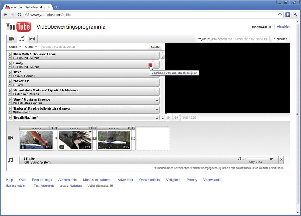 Rechtsboven ziet u een knopje Project. Hiermee kunt u een nieuw project maken, een bestaand project openen en projecten verwijderen. Daar weer naast staat de knop Publiceren, om uw video op te slaan en te publiceren op YouTube. Daaronder is het voorbeeldscherm om een voorvertoning te zien van de video’s en daar weer onder bevinden zich de tijdlijnen voor video en audio.
