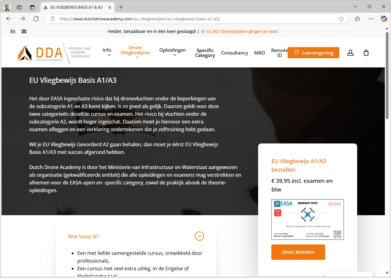 De meeste hobbydrones vallen in de open categorie, die is opgedeeld in A1, A2 en A3. Alleen voor drones zwaarder dan 250 gram is een vliegbewijs nodig. Hiervoor kun je online een kennistest doorlopen. Als je bent geslaagd kun je een vliegbewijs aanvragen bij de RDW. Dit kan allemaal online. De vliegscholen die door het ministerie van Infrastructuur en Waterstaat zijn aangewezen vind je op https://www.kwikr.nl/drles. Er is een basiscertificaat A1/A3. Dit kost ongeveer 40 tot 100 euro. Je kunt aanvullend het certificaat A2 halen. Je mag dan met zwaardere drones vliegen in bebouwde gebieden. Een vliegbewijs is vijf jaar geldig.