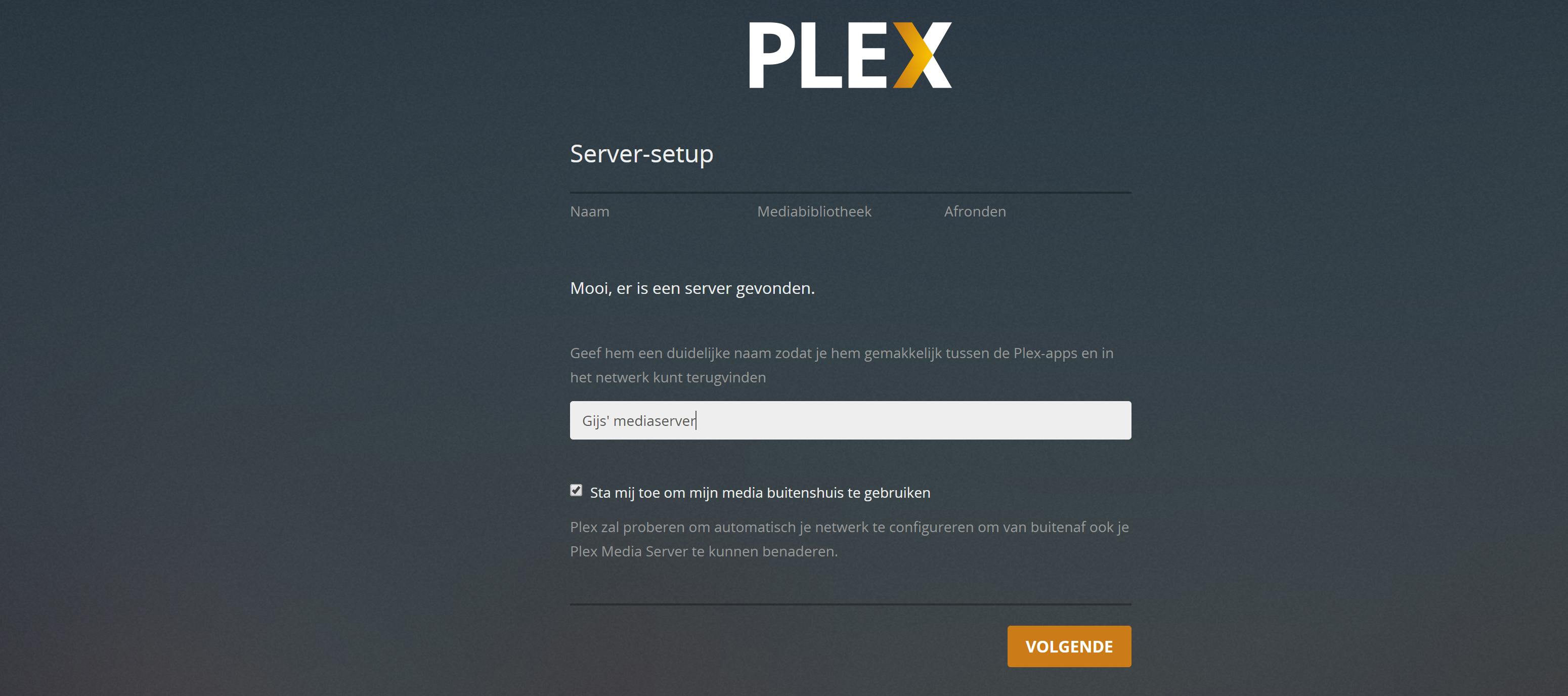 Eenmaal ingelogd kun je je Plex Media Server instellen. Bij de start zie je een pop-up die je probeert te verleiden een Plex Pass-abonnement te nemen. Zo’n abonnement (4,99 euro per maand) laat je onder meer op je mobiel streamen, media via de cloud synchroniseren - handig als je pc niet aanstaat - en video’s lokaal opslaan voor offline gebruik. Klik de melding weg met het kruisje rechtsboven, geef je mediaserver een naam en bepaal of deze ook buitenshuis benaderd mag worden. Druk daarna op Volgende.