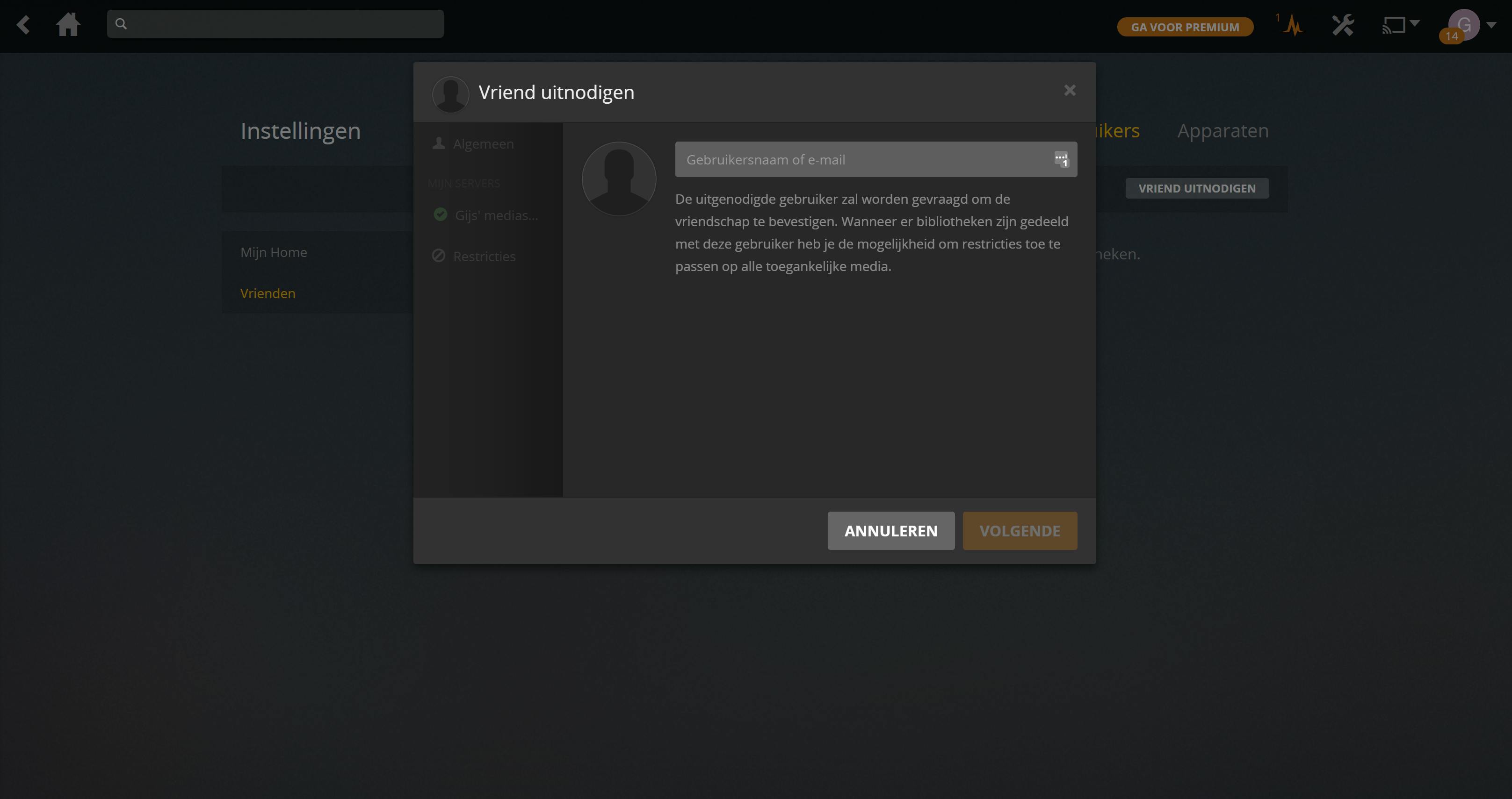 Ook voor het delen van je mediaserver heb je een Plex Pass nodig. Via Instellingen / Gebruikers / Vrienden heb je de mogelijkheid om gebruikers uit te nodigen voor je bibliotheek. Is er geen Plex-account gekoppeld aan het e-mailadres van je vriend(in), dan heeft die de mogelijkheid om eentje aan te maken. Als hoofdgebruiker kun je restricties toepassen en precies bepalen wie waartoe toegang heeft. Deel je je mediaserver met iemand buiten je netwerk, ga dan nog even naar Instellingen / Server en schakel de optie Toegang op Afstand in.