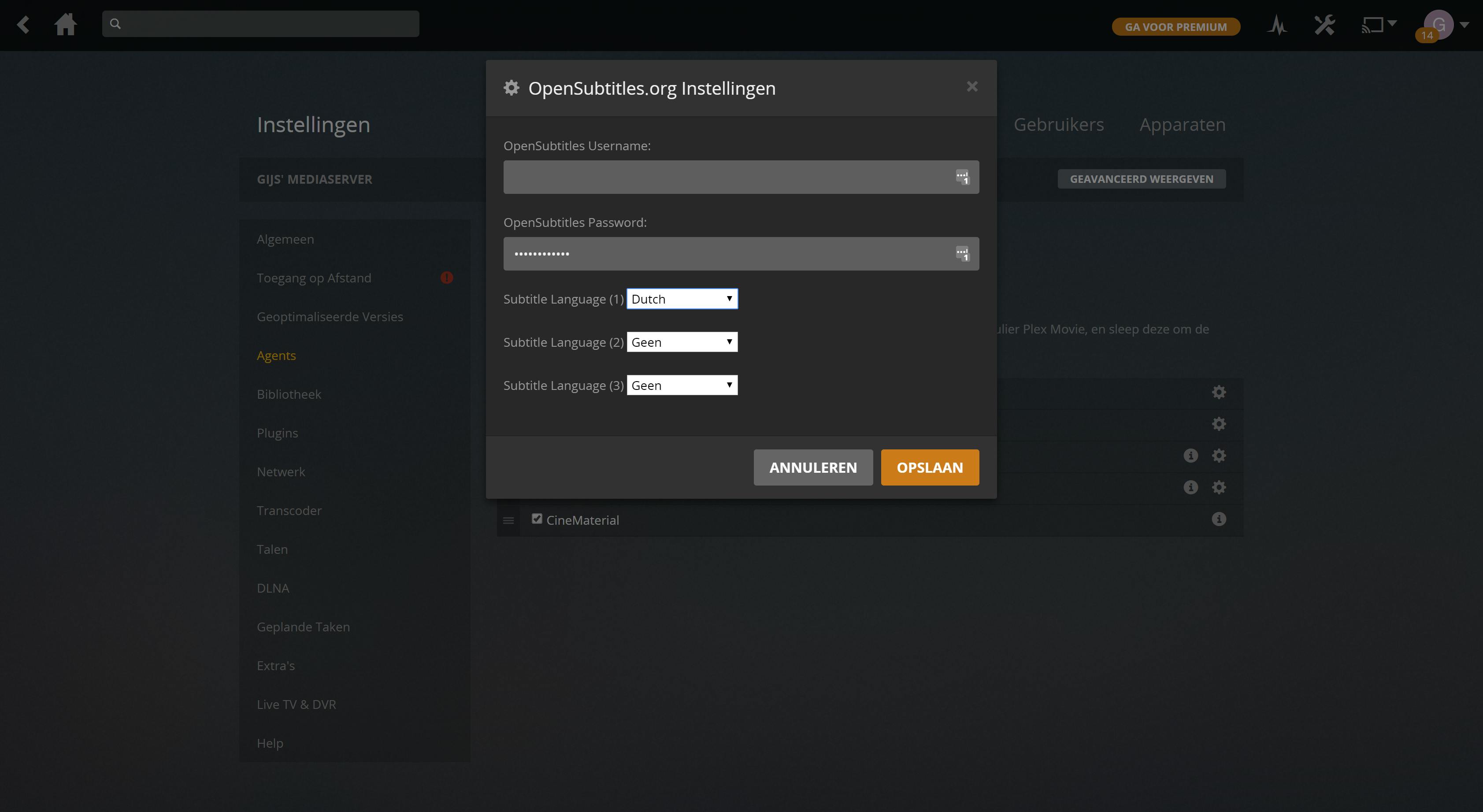 Bij het bekijken van buitenlandse films en series is het prettig ondertiteling te hebben. Plex Media Server ondersteunt alle gangbare formaten, waaronder srt en smi. Hoewel bij sommige gedownloade films en series ondertitels worden meegeleverd, is dat niet vanzelfsprekend. Daarom biedt Plex de mogelijkheid om ondertiteling automatisch in te laden. Ga naar Instellingen / Agents, klik op het tabblad Films of Series en vervolgens op Plex Movie. Zet een vinkje voor Opensubtitles.org en sleep deze optie naar boven. Zet ook bij Instellingen / Talen een vinkje voor Automatisch selecteren van audio en ondertiteling sporen.