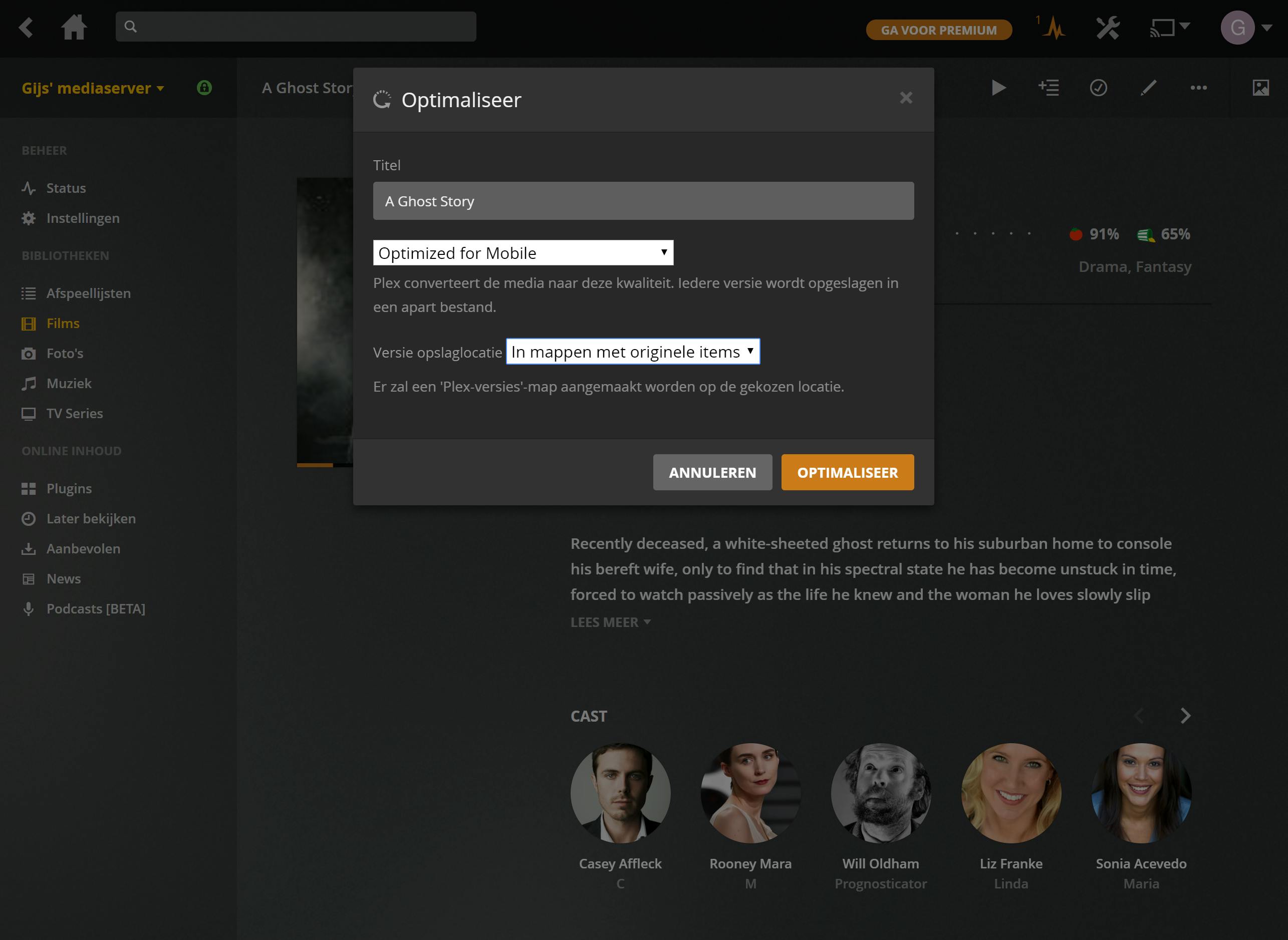 De Plex Media Optimizer maakt eenvoudig geoptimaliseerde versies van je video’s. Voor het kijken van een film op je smartphonescherm heb je immers geen 4K-resolutie nodig. Klik bij de gewenste video op de knop Meer… (herkenbaar aan drie puntjes) en kies voor Optimaliseer. Hierna kun je de titel, opslaglocatie en de kwaliteit selecteren. Het omzetten van een bestand van 6 GB duurt ongeveer tien minuten en de geconverteerde versie is te vinden onder Instellingen / Server / Geoptimaliseerde versies. Op een mobiel device speelt Plex automatisch de juiste versie af.