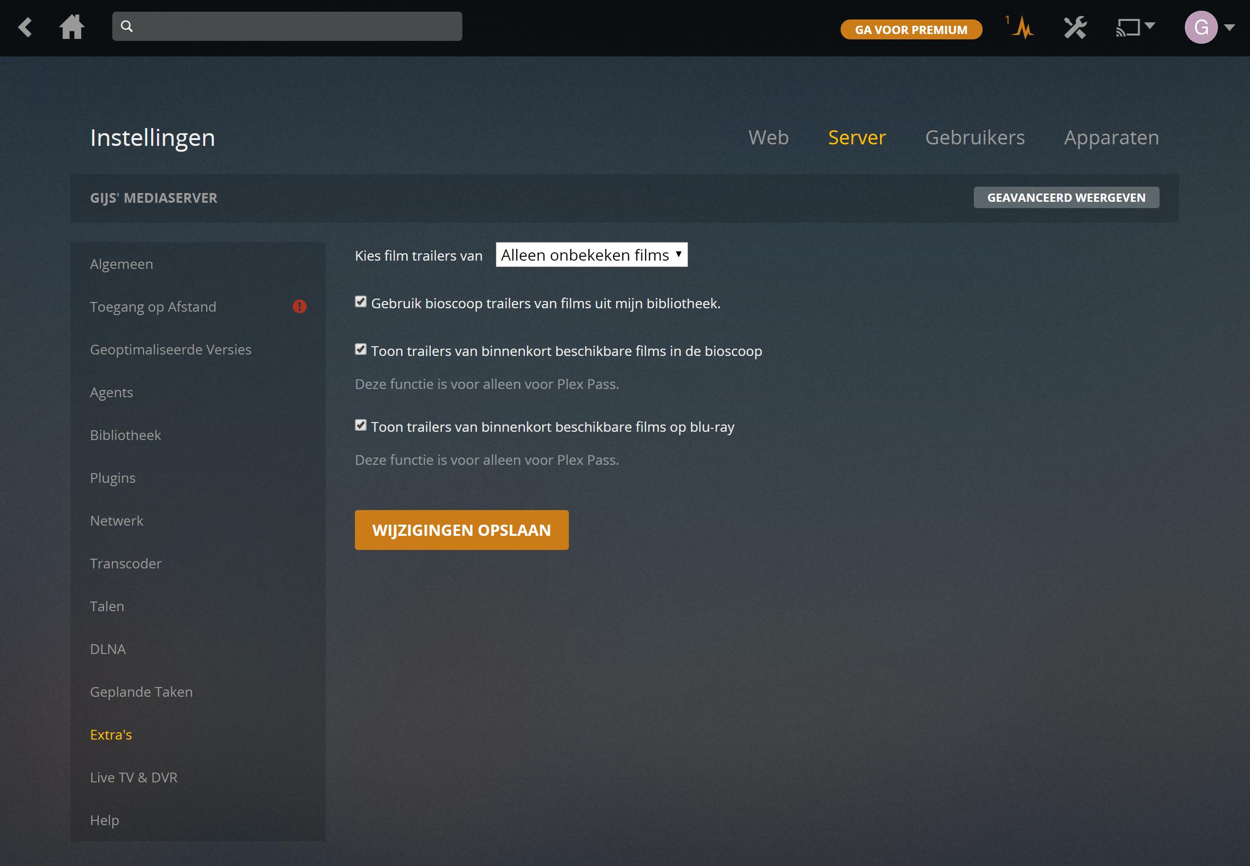 Voor het echte bioscoopgevoel kun je voorafgaand aan elke film trailers afspelen. Ga naar Instellingen / Server / Extra’s en zet een vinkje voor Toon trailers van binnenkort beschikbare films in de bioscoop. Hetzelfde kun je doen voor films die binnenkort op blu-ray verschijnen. Wel heb je voor deze functie een Plex Pass nodig. Heb je geen abonnement, dan kun je altijd nog handmatig trailers downloaden en toevoegen. Vergeet dan niet Local Media Assets (Movies) aan te vinken in Instellingen / Server / Agents.