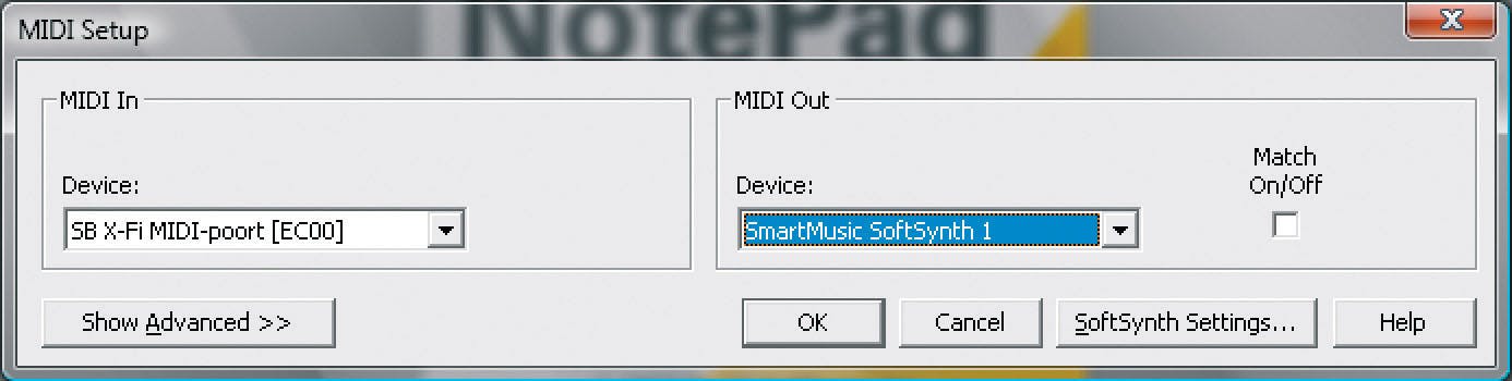 Surf naar www.kbsbv.nl/info_notepad.html en klik op Download Nu en vervolgens op Finale Notepad 2008. Vul uw gegevens in en klik op Verzend. Binnen enkele minuten ontvangt u een mail met daarin de downloadlink. Klik op de link en download het bestand NP2k8Win. zip (38,5 MB) naar een map naar keuze. Pak het zip-bestand uit en dubbelklik vervolgens op het zojuist uitgepakte NPWinSetup.exe. Vista-gebruikers geven eerst UAC-toestemming. Vervolgens klikt u op Next, I Agree, Next, Install en Finish. Dubbelklik nu op het pictogram Finale Notepad 2008 dat op uw Bureaublad is verschenen. Kopieer (Ctrl+C) het serienummer uit de ontvangen mail, plak (Ctrl+V) dit in het vak en klik twee maal op Continue. U komt nu in het midi-setup-venster.
