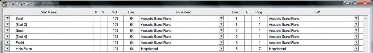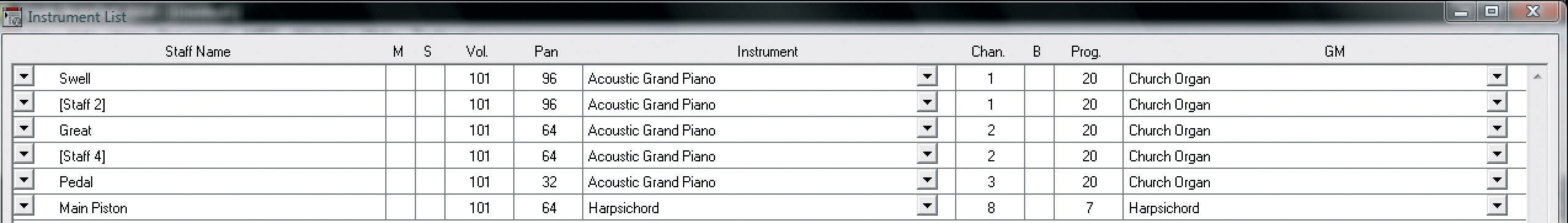 Het aanpassen van de klanken gebeurt in de kolom GM. Wanneer u daar op het driehoekje achter Acoustic Grand Piano klikt dan krijgt u een lijst met alle beschikbare klanken. Hier kiest u Church Organ. Omdat de eerste twee notenbalken (Swell) bij elkaar horen, verandert ook het instrument op de tweede regel. Verander op de zelfde manier de klank van Great en Pedal (Main Piston bevat geen noten, dus die laten we voor wat hij is). Ook kunnen we hier de positie van de instrumenten bepalen. Dat doen we door de getallen in de kolom Pan aan te passen (dubbelklikken en een ander getal intikken). Ook hier veranderen bij elkaar behorende balken samen. Geef bij Swell de waarde 96 en bij Pedal de waarde 32. Tot slot passen we de galm aan. Klik op het driehoekje achter Reverb Type en kies Large Hall. Vul bij Amount 50 in.