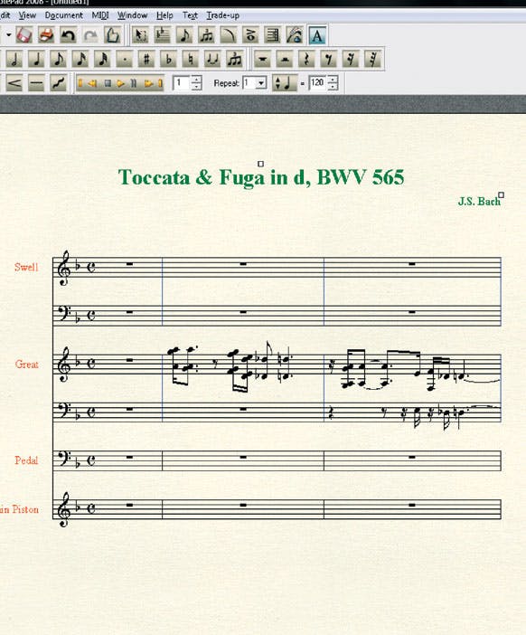 Sluit het instrument-venster en speel het stuk opnieuw. Kijk, zo was het bedoeld: een kerkorgel met een fikse galm. Op deze manier kunt u van elk stuk - van een ander of van uzelf - de instrumentatie aanpassen. Zoals u ziet ontbreken titel en componist. Bij nieuwe stukken kunt u die als eerste invoeren, maar nu moeten we de tekst die er al staat aanpassen. Klik daarvoor op het Text-gereedschap (letter A) en dubbelklik op het witte vierkantje boven Title. Klik achter Title en toets Backspace om het woord Title te wissen. Tik nu 'Toccata & Fuga in d, BWV 565'. Verander op de zelfde manier het woord Composer in J.S. Bach.