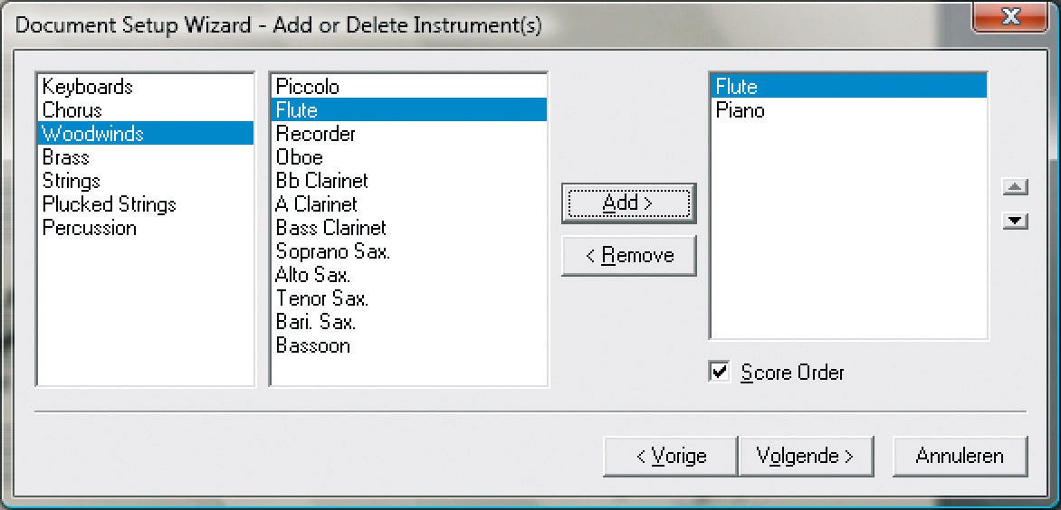 Hoogste tijd om het werk op te slaan. Kies File, Save As, geef de ingevoerde titel als bestandsnaam en klik op Opslaan. Het bestand wordt nu in Finale's eigen mus-formaat opgeslagen. Met de hier beschreven methode kunt u makkelijk aan (klassieke) bladmuziek komen want Finale heeft een prima afdrukfunctie. Voor de functies voor muziek invoeren en wijzigen kunnen we nu een nieuw stuk gaan maken. Kies File, New. Vul bij Titel in 'Mijn eerste hit' en bij Composer uw naam. Kies bij Page Size voor A4 en klik op Volgende. Nu moet u bepalen voor welke instrumenten het stuk bedoeld is. U kunt kiezen uit toetsinstrumenten (keyboards), stemmen (chorus), blaasinstrumenten, enzovoort. Klik op Piano en Add om een piano toe te voegen. Voeg ook Woodwinds, Flute toe en klik op Volgende.