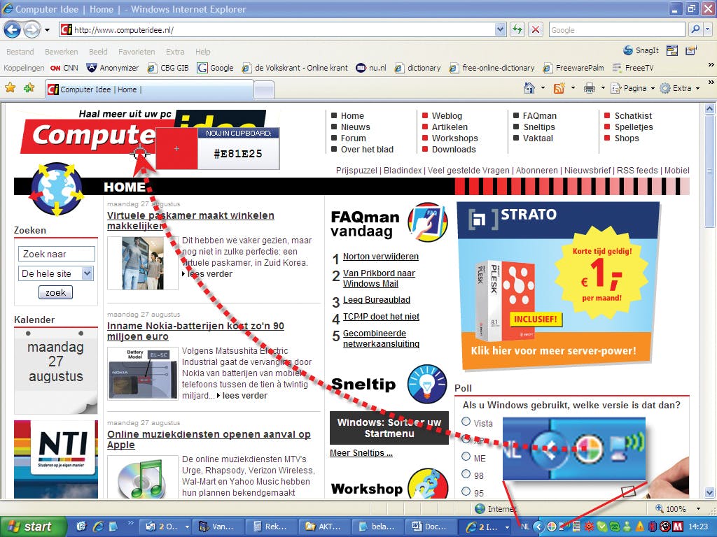 Zoals beloofd wilden we 'Computer Idee rood' gebruiken, start daarvoor Internet Explorer en ga naar www.computeridee.nl. Klik dan met de linker muisknop op het Eydropper-pictogram en beweeg - terwijl u de muisknop ingedrukt houdt - naar het rode deel van het Computer Idee-logo bovenaan de pagina. U ziet een venstertje bij de muispijl dat de exacte kleurwaarden weergeeft terwijl u de muis over het scherm beweegt. Eenmaal aangekomen op het rode deel laat u de muisknop los, waarna de gemeten waarde op het Windows Klembord gezet wordt.