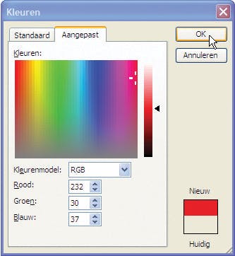 Om die vervolgens in Word te gebruiken klikt u aldaar in het menu Opmaak onder Achtergrond op Meer kleuren. In het venster Kleuren selecteert u op het tabblad Aangepast achter Kleurenmodel de optie RGB (standaardkeuze). Vul dan in de velden achter Rood, Groen en Blauw de waarden in die u net in het Kladblokvenster hebt geplakt, in ons voorbeeld dus 232, 30 en 37.