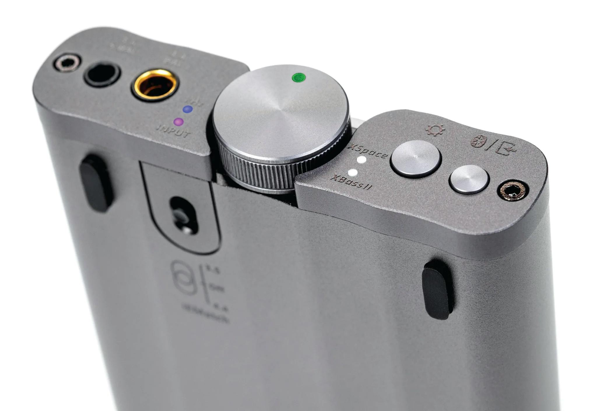 De bovenzijde van de behuizing bevat een eenvoudig oledscherm. Lees hierop verschillende gegevens af, zoals de actieve ingangsbron, audiokwaliteit en codec. Verder bekijk je ook het huidige volumeniveau en houd je de resterende batterijcapaciteit in de gaten.