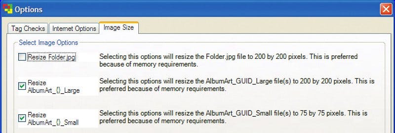Klik nu eerst in het menu Tools op Options. Op het tabblad Tag Checks maakt u de twee onderste selectievakjes leeg én het tweede vakje vanaf boven. De desbetreffende opties zijn niet relevant voor albumhoezen en leiden waarschijnlijk tot ongewenste aanpassingen als u ze gemarkeerd laat! De bovenste optie heeft ook niets met albumhoezen te maken, maar zoekt wel naar ontbrekende informatie die belangrijk is voor de mediabibliotheek. Klik op OK om de instellingen te bewaren. Nog een opmerking voor degenen die al handmatig albumhoezen hebben toegevoegd; grote afbeeldingen worden door het programma automatisch verkleind tot 200 bij 200 pixels. Dat zijn de afmetingen waar Windows Media Player en Media Center graag mee werken.