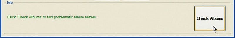 Art Fixer zoekt in de mediabibliotheek van Windows Media Player of Media Center naar alle muziekalbums. Klik op de knop Check Albums om het eerstvolgende album met 'problemen' te vinden. Die knop verschijnt trouwens alleen als er geen probleem wordt gevonden bij het eerste album. Een probleem kan een ontbrekende albumhoes zijn, maar ook ontbrekende systeembestanden voor albumhoezen of andere fouten. De mediabibliotheek moet trouwens wel op de juiste mappen zijn ingesteld om alle albums te vinden. Dat kan bijvoorbeeld via de toets F3 in Windows Media Player.