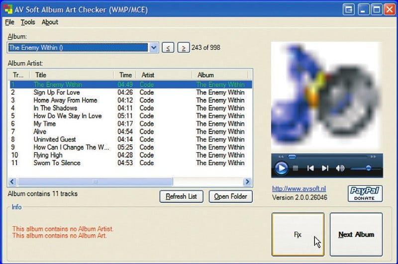 Een ontbrekende albumhoes wordt aangegeven door de tekst This album contains no Album Art en een algemene afbeelding rechtsboven. Klik op de knop Fix om dit probleem te verhelpen. Bij de melding This album contains no Album Artist of andere foutmeldingen is het ook verstandig op Fix te klikken.
