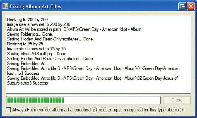 Als er wel een albumhoes aanwezig is, maar die blijkt niet optimaal ingesteld voor Windows Media Player en Media Center, ziet u het venster Fixing Album Art Files. In alle andere gevallen komt u meteen bij Stap 6. De aanwezige albumhoes wordt automatisch geoptimaliseerd voor Windows Media Player en Media Center. Daarbij wordt de grootte aangepast en wordt ook een verkleinde versie in het muziekbestand bewaard. Dat is nodig om op sommige draagbare spelers de albumhoes te kunnen weergeven. Klik op Close als de aanpassingen zijn uitgevoerd. Om dit venster voortaan over te slaan, markeert u eerst het selectievakje.