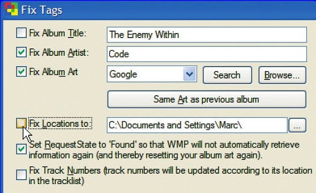 Controleer in het venster Fix Tags welke zaken Art Fixer wil gaan aanpassen en schakel ongewenste correcties uit. Zo verplaatst de optie Fix Locations to alle nummers van het album naar een enkele, andere map. Dat zal waarschijnlijk niet de bedoeling zijn, dus maak dit vakje leeg! Ook de optie Fix Track Numbers kunt u beter deactiveren. De optie Set Request State is wel heel handig en moet u markeren. Hiermee voorkomt u dat Windows Media Player of Media Center zelf gegevens of albumhoezen gaat vervangen en daarmee uw bibliotheek in de war schopt. Markeer Fix Album Artist om albums onder de juiste artiestnaam te laten verschijnen en Fix Album Art om de hoes te vervangen. Normaliter kunt u dus dezelfde opties activeren als in de afbeelding. Klik daarna op Search om een albumhoes te zoeken.