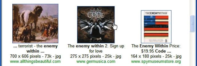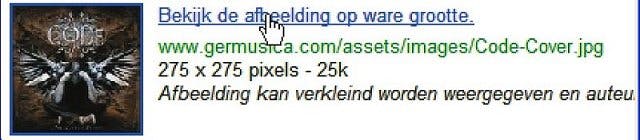 U ziet onderin het dialoogvenster een webpagina met zoekresultaten. Klik op de gewenste albumhoes. Kies een afbeelding waaronder een grootte van 200 x 200 pixels of meer wordt aangegeven en jpg als bestandstype. Als u niet weet hoe de hoes eruitziet, kunt u afgaan op de overige tekst onder de afbeelding. De eerste regel (afbeeldingstekst) en laatste regel (naam van de website) geven vaak wel aan of u met de hoes van een muziekalbum te maken hebt. Gebruik de schuifbalk en de koppelingen onderaan de webpagina om meer afbeeldingen te zien. U kunt ook het dialoogvenster groter maken of maximaliseren.