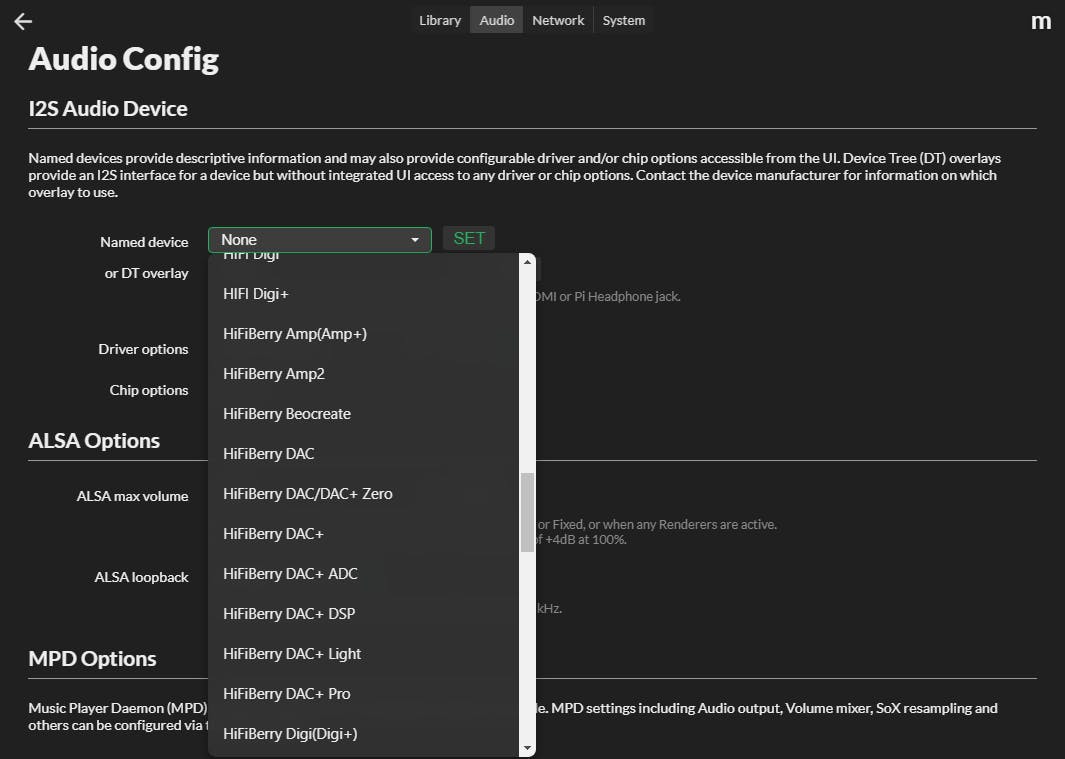Heb je een I2S-DAC op de Raspberry Pi aangesloten, bijvoorbeeld een exemplaar van HiFiBerry, Audiophonics of IQaudIO? Geef dan bij Named device exact aan om welke DAC het gaat en bevestig met SET. Als je audio via usb, HDMI of de analoge 3,5mm-output doorstuurt, kies je achter Named device altijd voor None.