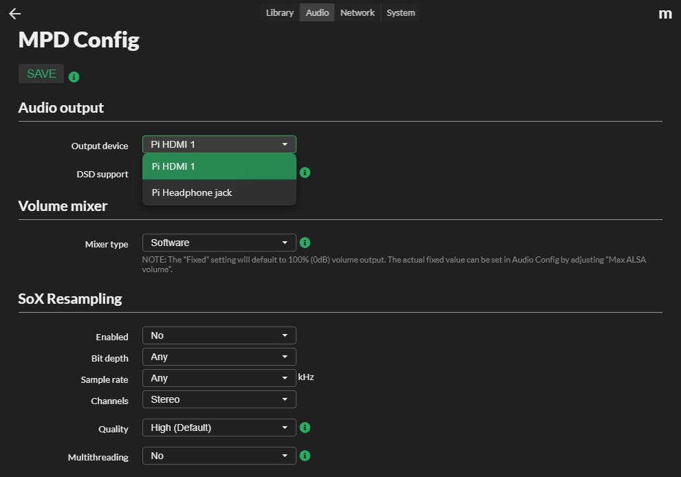 Scrol zo nodig een stukje omlaag en klik achter MPD settings op EDIT. Er verschijnt een nieuwe webpagina met een aantal belangrijke geluidsinstellingen. Wanneer je geen DAC gebruikt, geef je achter Output device aan of je het audiosignaal via HDMI of de 3,5mm-geluidsuitgang wilt doorsturen.