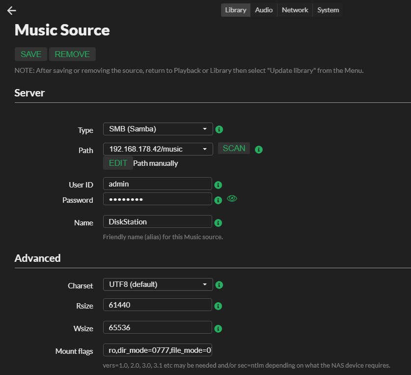 Het gebruik van een audiostreamer heeft pas meerwaarde wanneer je de inhoud van netwerkbronnen aan de bibliotheek kunt toevoegen. Dankzij ondersteuning voor protocollen als UPnP, DLNA, SMB en NFS kun je alle kanten op. Voeg bijvoorbeeld een gedeelde map of mediaserver van een NAS toe. Ga naar M / Configure / Library en klik onder Music Sources op CREATE. Je bepaalt achter Type via welk protocol je een netwerkbron wilt toevoegen. Kies EDIT en vul vervolgens het juiste pad in.