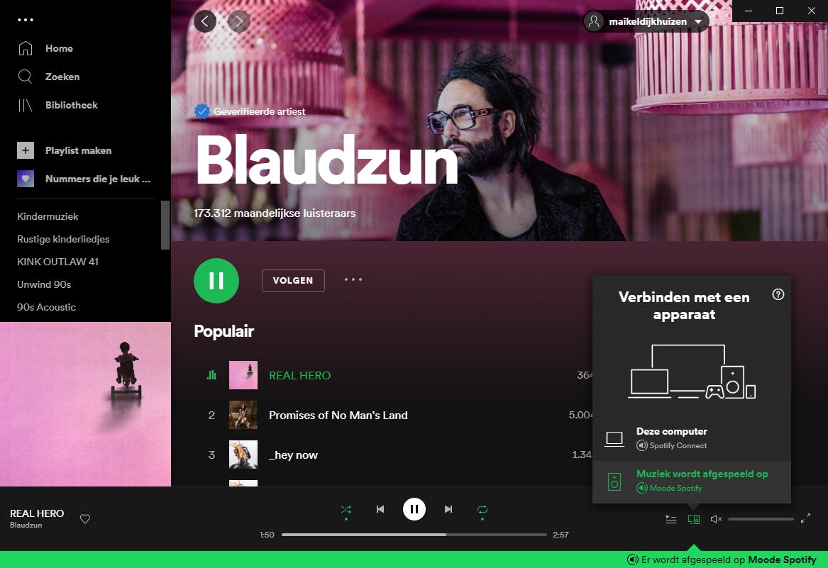Je activeert de schakelaar achter Spotify en bevestigt met SET. Open nu de Spotify-app op een willekeurig apparaat. Via het pictogram met de monitor en het speakertje kun je de Raspberry Pi-audiostreamer met de Spotify-app verbinden. Klik hiervoor op Moode Spotify. Start nu een afspeellijst om die via de gekoppelde hifi-installatie van MoOde Audio te beluisteren.
