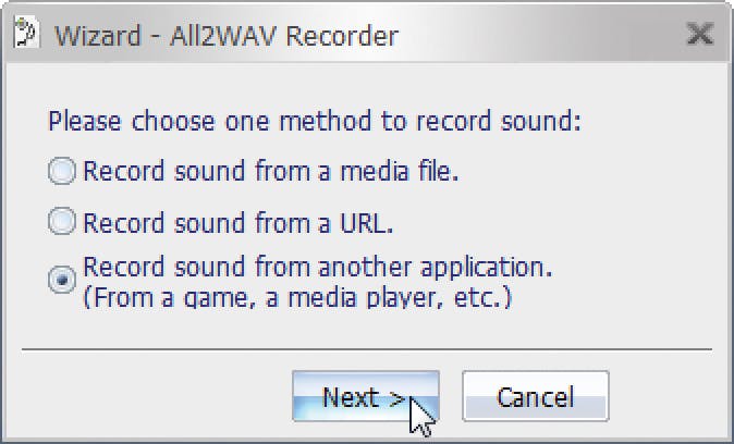 Om te beginnen hoeft u niet te proberen de ‘stream’ te decoderen, aangezien die zwaar is beveiligd met een welhaast onkraakbare sleutel. Slimme software zorgt dat het geluid wordt opgepikt op het moment dat het geluid naar de geluidskaart wordt gestuurd. Een van de simpelste en boven -dien kosteloze programma’s is All2WAV Recorder, te vinden op www.naturpic.com/all2wav . Het aardige is dat het niet alleen met Spotify werkt, maar in staat is alles wat u op de pc hoort op te nemen. Kortom: wilt u ook nog andere radiostreams opnemen vanuit bijvoorbeeld de browser, dan behoort dit tot de mogelijkheden. Diezelfde allround-mogelijkheden leveren tegelijkertijd ook wat beperkingen op bij Spotify, daarover later meer. Zorg dat Spotify is gestart en een muzieknummer via de live-stream speelt. Download dan All2WAV Recorder vanaf de genoemde site en installeer het programma. Start het program -ma, selecteer in de eerste stap van de wizard de optie Record sound from another applicati-on en klik op Next.