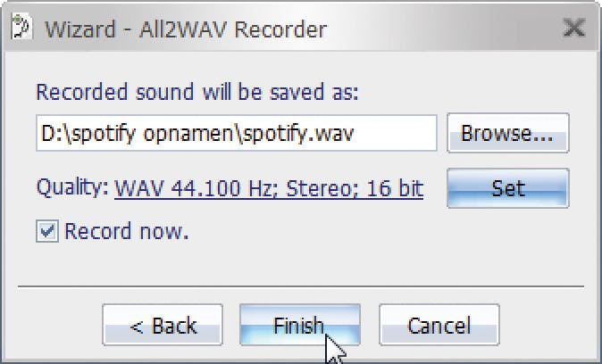 Klik op de knop Browse in het veld achter de opnamemap (eerste veld in de nu voor u staande stap) en kies een map en een bestandsnaam die u later nog eens kunt terugvin -den. Standaard is de programmamap van All2Wav Recorder gekozen en dat is natuurlijk niet de meest praktische oplos -sing. De gekozen kwaliteitsinstelling is in orde, maar omdat All2WAV Recorder – zoals de naam al doet vermoeden – alleen in ongecomprimeerd .wav-formaat kan opnemen, hebt u flink wat vrije schijfruimte nodig. Een uurtje muziek in standaard cd-kwaliteit kost circa 640 Megabyte. Zorg dat de optie Record now is ingeschakeld en klik op Finish.