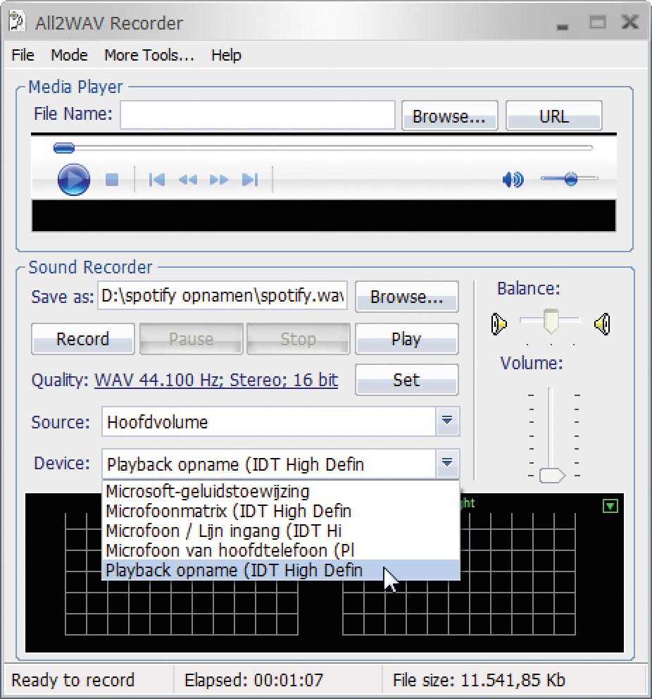 Als het goed is, begint All-2WAV direct met opnemen. Toch is de kans groot dat het niet allemaal meteen zo loopt als gewenst, want vaak wordt er opgenomen via de microfooningang. In het geval van een notebook is dat eenvoudig te controleren door tegen de microfoon te tikken: u ziet dan het volumegrafiekje onder aan het opnamevenster de hoogte in schieten. Omdat dit natuurlijk niet de bedoeling is, dient er dan nog wat veranderd te worden aan de geluidsinstellin -gen van Windows zelf. Probleem is alleen dat dit per merk kaart een beetje verschilt. Soms gaat alles in één keer goed en soms moet u te werk gaan zoals uitgelegd op www. naturpic.com/all2wav/record-sound-win7.htm.