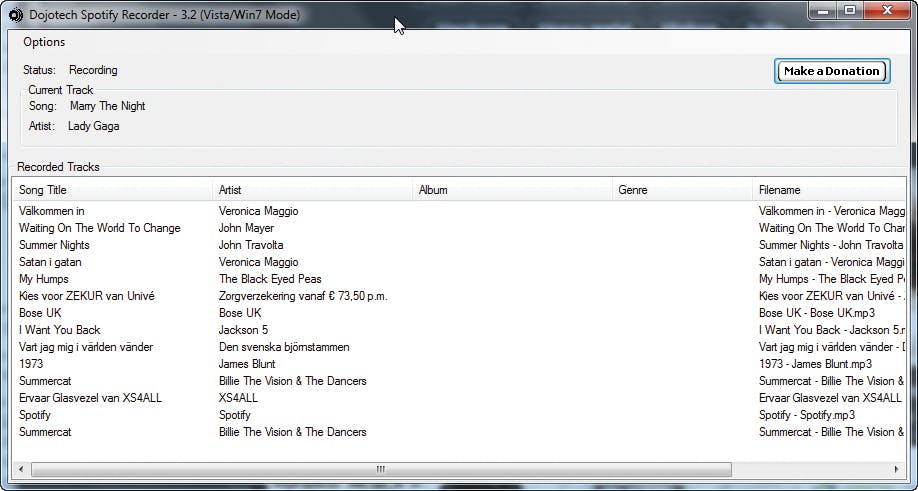 Het werkt dus allemaal wel met All2WAV en een gegeven paard mag u niet in de bek kijken. Dat het echter stukken geavanceerder kan bewijst Dojotech met Spotify Recorder, te vinden op www.dojotech.com. Oké, de oplossing is niet gratis, maar voor slechts 10 Britse Pond (11,67 euro) haalt u een geweldige portie gebruiksgemak in huis. Na betalen, downloaden, unzippen en installeren blijkt Spotify Recorder namelijk niet alleen van Spotifystreams te kunnen opnemen, maar de afzonderlijke nummers ook netjes apart op te slaan, voorzien van de juiste naamgeving! En dat zonder dat u er ook maar een instelling voor hoeft te maken.