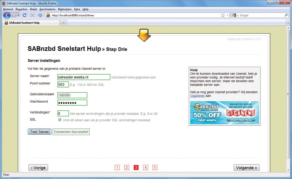 Nadat u de installatie hebt afgerond, opent automatisch SABnzbd in uw webbrowser. U bedient de software namelijk volledig in Internet Explorer, Firefox, Chrome of een ander surfprogramma. Kies in de Quick-Start Wizard opnieuw de Nederlandse taal en klik op de knop Start Wizard, waarmee u het programma in enkele stappen configureert. U selecteert in de eerste stap een aangename vormgeving waarin u wilt werken. In deze workshop wordt de standaardinterface gebruikt. Vervolgens geeft u aan of u het programma op één computer of met meerdere pc's in een thuisnetwerk wilt gebruiken. U hebt de mogelijkheid om de software te beveiligen met een gebruikersnaam en een wachtwoord. Voor het downloaden uit de nieuwsgroepen is het een voorwaarde dat u toegang hebt tot een nieuwsserver. Sommige internetproviders bieden die als extra service aan, maar in de meeste gevallen bent u aangewezen op een betaalde server van een commerciële aanbieder. Op http://www.newsxs.nl/proef meldt u zich aan voor een gratis proefabonnement van veertien dagen. Bij de derde stap van de wizard vult u alle gegevens van uw nieuwsserver in, zoals servernaam, poortnummer, gebruikersnaam en wachtwoord. Geef verder het maximumaantal verbindingen aan. U versleutelt het dataverkeer indien gewenst met ssl, mits uw nieuwsserver dat ondersteunt. Gebruik de knop Test server om te controleren of de verbinding goed werkt. Sla de laatste stap over, waarna SABnzbd herstart.