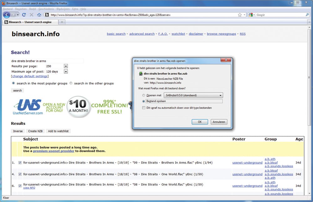 U hebt in de vorige stappen SABnzbd op een juiste manier geconfigureerd, zodat u kunt downloaden uit de nieuwsgroepen. Nu hebt u alleen nog geschikte downloadbestanden nodig. Surf naar http://www.binsearch.info/ om leuke muziek te vinden. Typ in het zoekvak een trefwoord, bijvoorbeeld de naam van een artiest. Selecteer bij Results per page het getal 250 en geef bij Maximum age of post aan wat de leeftijd van de bestanden mag zijn. Dat is van toepassing met betrekking tot de retentie van de gebruikte nieuwsserver. NewsXS biedt bijvoorbeeld een retentie aan van 230 dagen. Zodra een muziekalbum langer dan deze periode op een server staat, wordt het automatisch verwijderd. Vervolgens kunt u het niet meer downloaden. Uw zoekactie past u hier gemakkelijk op aan. Klik op de knop Search, waarna er vervolgens een overzicht met resultaten verschijnt. U zult complete albums tegenkomen, maar ook losse nummers. Soms staan de bestandsgrootte en het mediaformaat erbij vermeld. Aan de hand van dergelijke gegevens kunt u een inschatting maken van de kwaliteit. Hebt u te veel zoekresultaten? Probeer dan de zoekterm te specificeren door bijvoorbeeld de naam van en artiest en de titel van een album in het tekstveld te combineren. Houd er rekening mee dat u naast audio ook beeldmateriaal van artiesten kunt tegenkomen, zoals videoclips, albumhoesjes en muziek dvd's. Plaats een vinkje voor alle onderdelen die u wilt downloaden. Klik op de knop Create NZB en bewaar het nzb-bestand op uw harde schijf.