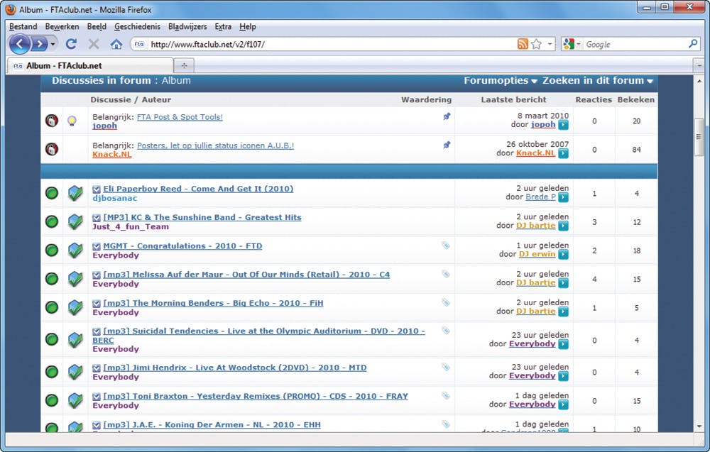 Vindt u het leuk om onbekende bandjes te ontdekken? Met behulp van een nieuwsgroepenforum snuffelt u gemakkelijk door het beschikbare aanbod. Surf naar http://www.ftaclub.net/ en klik op Registreer om een account aan te maken. Ga akkoord met de forumregels en bevestig nogmaals met Registreer. Vul alle onderdelen van het formulier in en klik op Registratie voltooien. Open uw mailbox en klik op de link om het account te activeren. U hebt nu onbeperkte toegang tot de website. Scroll op de beginpagina naar beneden tot u de categorie Muziek hebt bereikt. Open een subcategorie om het aanbod te bekijken. Mocht u iets interessants hebben gevonden, dan bestudeert u specifieke informatie over het muziekalbum. U bekijkt bijvoorbeeld de tracklijst en controleert de oorspronkelijke bron van de post. Als u de muziek graag wilt downloaden, laat u onderaan de pagina eerst een berichtje achter. Vervolgens ziet u de bestandsnaam verschijnen, wat u gemakkelijk kopieert naar www.binsearch.info. Op die manier creëert u een nzb-bestand van het muziekalbum.