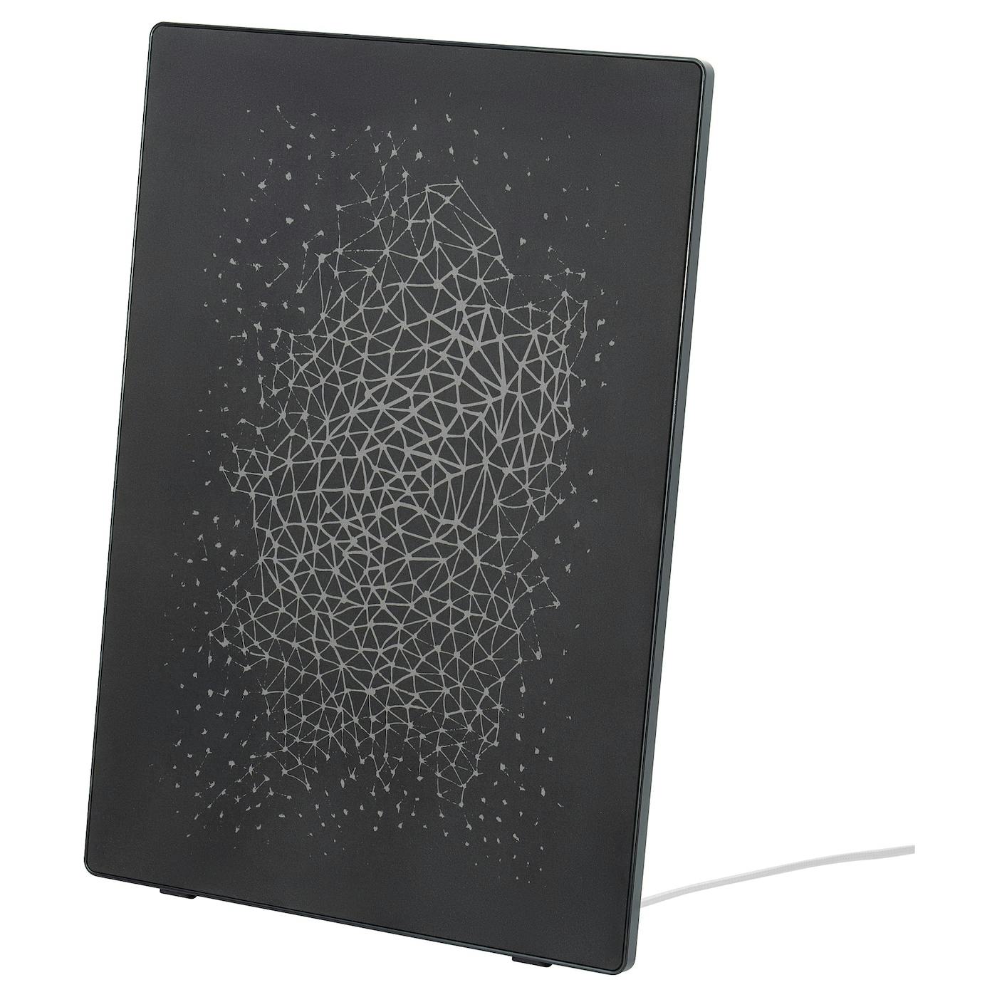 Dit is een schilderij van 57 × 41 centimeter met een diepte van 6 centimeter. Achter het verwisselbare stoffen doek zit een Sonos-speaker. Het kunststof frame van het schilderij voelt degelijk aan en hij past qua formaat en gewicht zowel op een bureau als aan de muur. Het doek haal je binnen een minuut los. IKEA biedt elf andere doeken aan met prijzen van 15 of 30 euro – best prijzig.