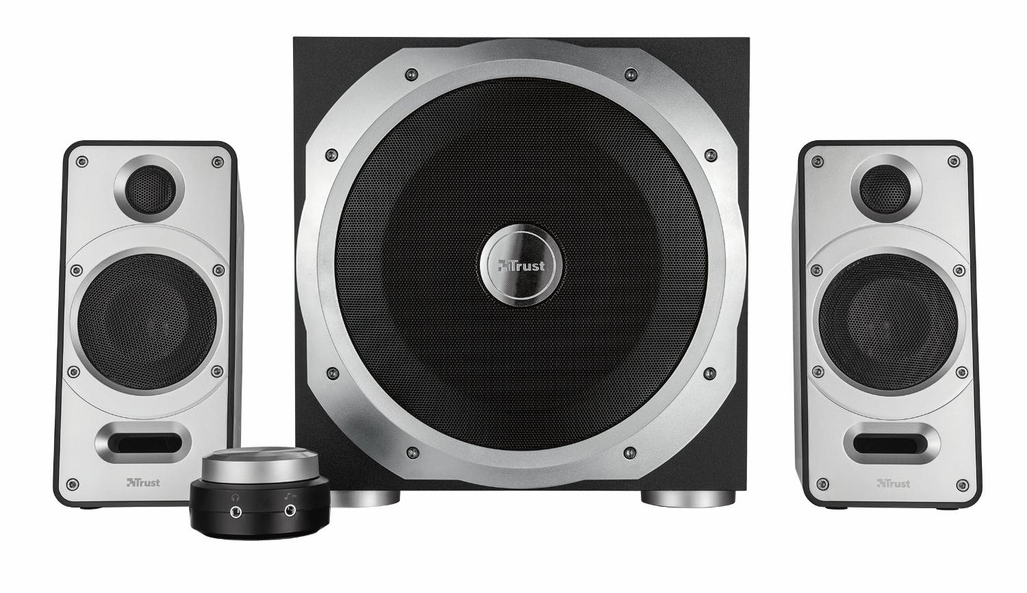 Een 2.1-speakerset die je heel veel in de winkels aantreft is de Trust Byron, bestaand uit een uit de kluiten gewassen subwoofer en twee satellieten met ogenschijnlijk aparte tweeter en mid-range driver, die een gewichtige indruk maken. Hij kost zo’n 80 à 90 euro, wat duidelijk meer is dan de eerder veel aangeboden Tytan-set, die op papier zeer vergelijkbaar lijkt. Trust belooft 120 watt vermogen en een krachtige bas.