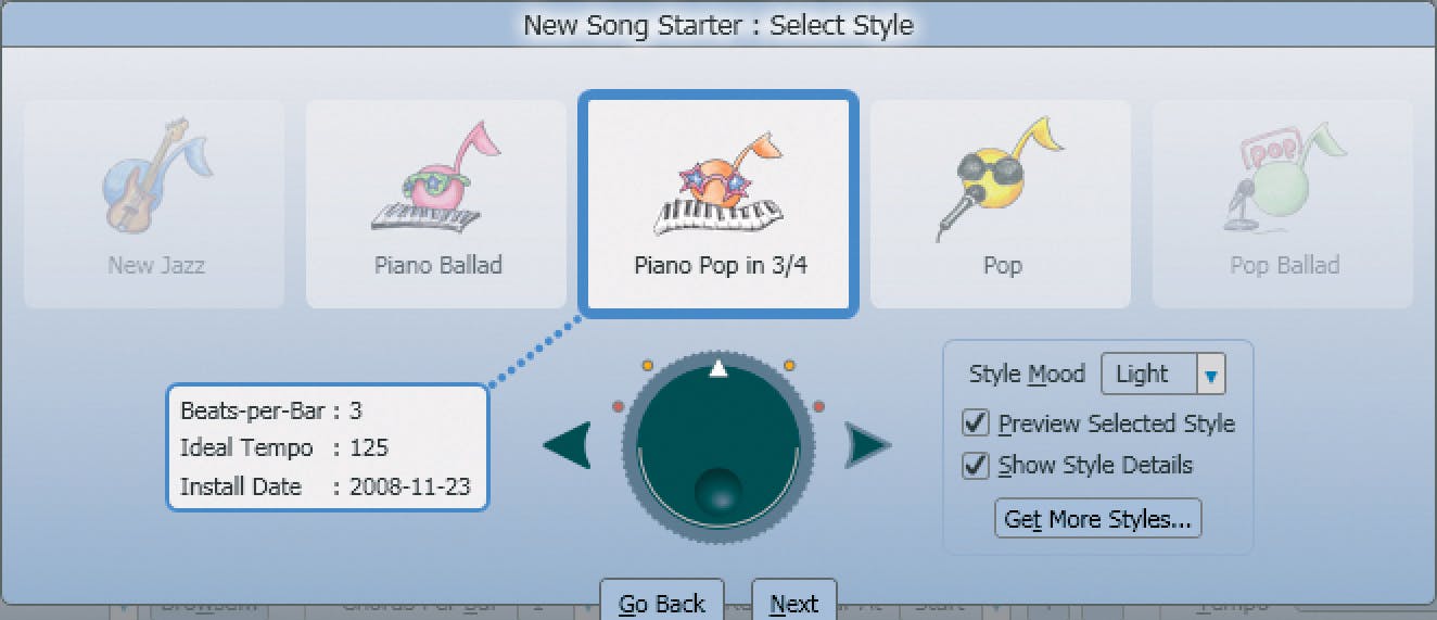 Klik op New Song en op Next. U moet nu een stijl kiezen voor het nummer wat u wilt gaan maken. Songsmith heeft allerlei bekende muziekstijlen aan boord zoals Pop, Ballad, R&B, Reggae, Techno, enzovoort. Met de driehoekjes of het virtuele jogwheel navigeert u door de stijlen. Blijft u op een stijl staan, dan hoort u een demootje. Elke stijl kent twee variaties genaamd moods, namelijk Light en Lively. Wij kiezen als stijl Piano Pop 3/4, Light.