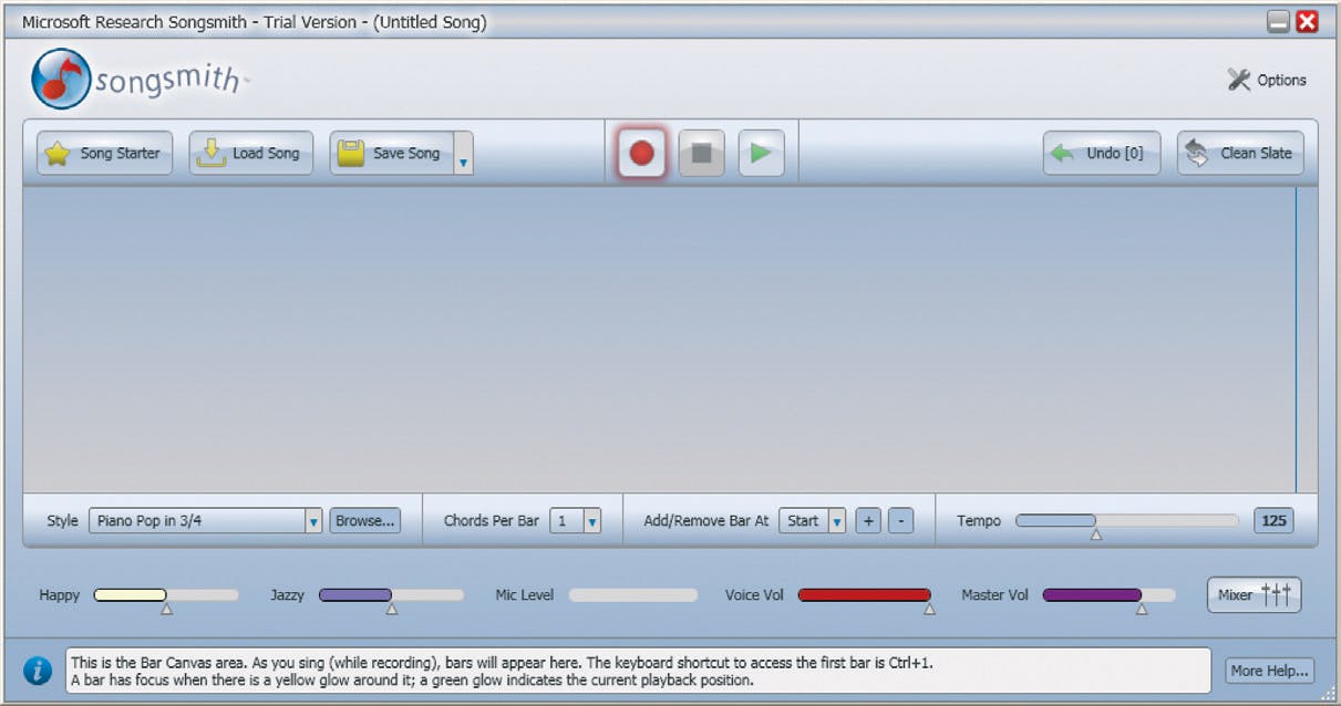 Surf naar de downloadsite van Microsoft en download daar de probeerversie van Songsmith (100 MB). Met deze versie kunt u zes uur werken (dat wil zeggen dat u het programma gedurende zoveel uur daadwerkelijk kunt gebruiken. Als u het programma minimaliseert of uit zet loopt de tijd dus niet door). Wilt u na deze periode het programma blijven gebruiken, dan kunt u het kopen voor ongeveer 25 Engelse ponden. Installeer nu het programma. Het kan voorkomen dat u niet de juiste versie van .NET hebt geïnstalleerd, maar dan zal de installatieprocedure van Songsmith u daar op wijzen. Start na installatie het programma.