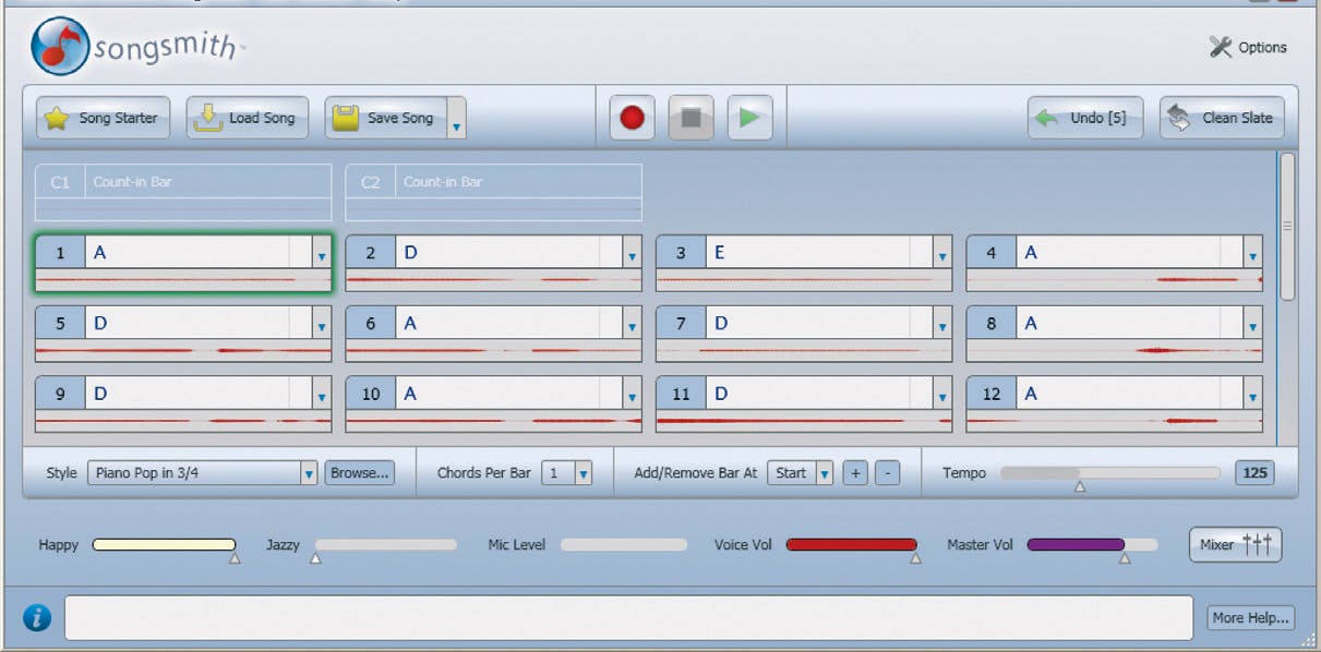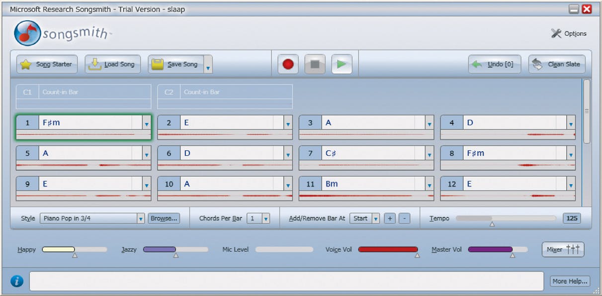 De akkoorden die het programma op ons gezang heeft gemaakt (beginnend met F-kruis-m, E, A, D) doen niet helemaal denken aan de gekozen melodie. Het beginakkoord (C is gebruikelijk, waarbij E de begintoon is) wijkt af omdat we blijkbaar op een ander toonhoogte dan E hebben ingezet. Blijkbaar hebben we ingezet op C-kruis, zodat het lied nu in A wordt gespeeld maar ook zonder deze muzikale achtergrond kan Songsmith het lied opschonen. Daarvoor dienen de schuifjes Happy en Jazzy links onderin. Door met Happy te spelen vermindert of vermeerdert u het aantal mineurakkoorden (meer Happy is minder mineur). We zetten Happy helemaal naar rechts. Door het schuifje Jazzy naar rechts te bewegen kiest het programma meer exotische akkoorden zoals overmatige of verminderde. Dat willen we nu niet en dus zetten we hem helemaal naar links. Het resultaat is een behoorlijk cleane versie van ons lied met alleen majeur-akkoorden.