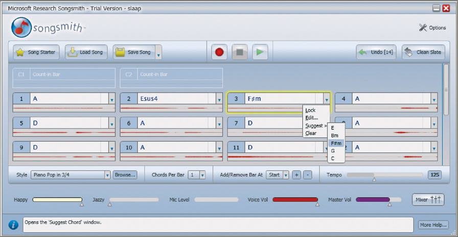 Luisteren we deze versie af dan merken we helaas dat het resultaat er niet beter op is geworden. Weliswaar passen de majeur-akkoorden beter bij het lied maar we horen regelmatig botsingen tussen akkoorden en melodie. Songsmith kent meerdere mogelijkheden om hier verder aan te sleutelen. Door op het driehoekje in een maat te klikken, verschijnt een keuzemenu. Met de optie Suggest in dit menu kunt u een ander akkoord kiezen dat verwant is aan het akkoord dat Songsmith voorstelt. U krijgt de alternatieven ook te horen en door ze te proberen kunt u op het gehoor de melodie opschonen. De A, D, E waarmee ons muziekje begint kunnen we zo bijvoorbeeld omzetten naar A, Esus4, F-kruis-m voor een kloppender begin. Overigens hoeft u bij zo'n correctie de muziek niet telkens vanaf het begin te spelen. Door te dubbelklikken op een maat speelt Songsmith het stuk vanaf die plek.