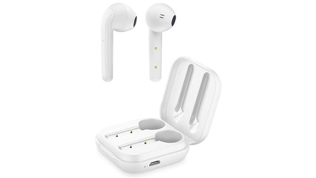 Echt draadloze oordoppen kosten vaak (veel) meer dan honderd euro. Het Italiaanse bedrijf Cellularline verkoopt zijn kleine, lichte Java True Wireless (TWS) earphones voor minder dan zeventig euro. Ze zijn verkrijgbaar in wit, zwart, blauw en roze. De Java oordoppen hebben een ‘open-fit’ design, met microfoons die zich in staafjes bevinden die naar onderen gericht uit je oorschelpen ‘hangen’. De laadcontacten bevinden zich aan de binnenzijde van die microfoonstaafjes; je laadt ze op of bij in het meegeleverde piepkleine laadetui, waarin de doppen magnetisch vastklikken.