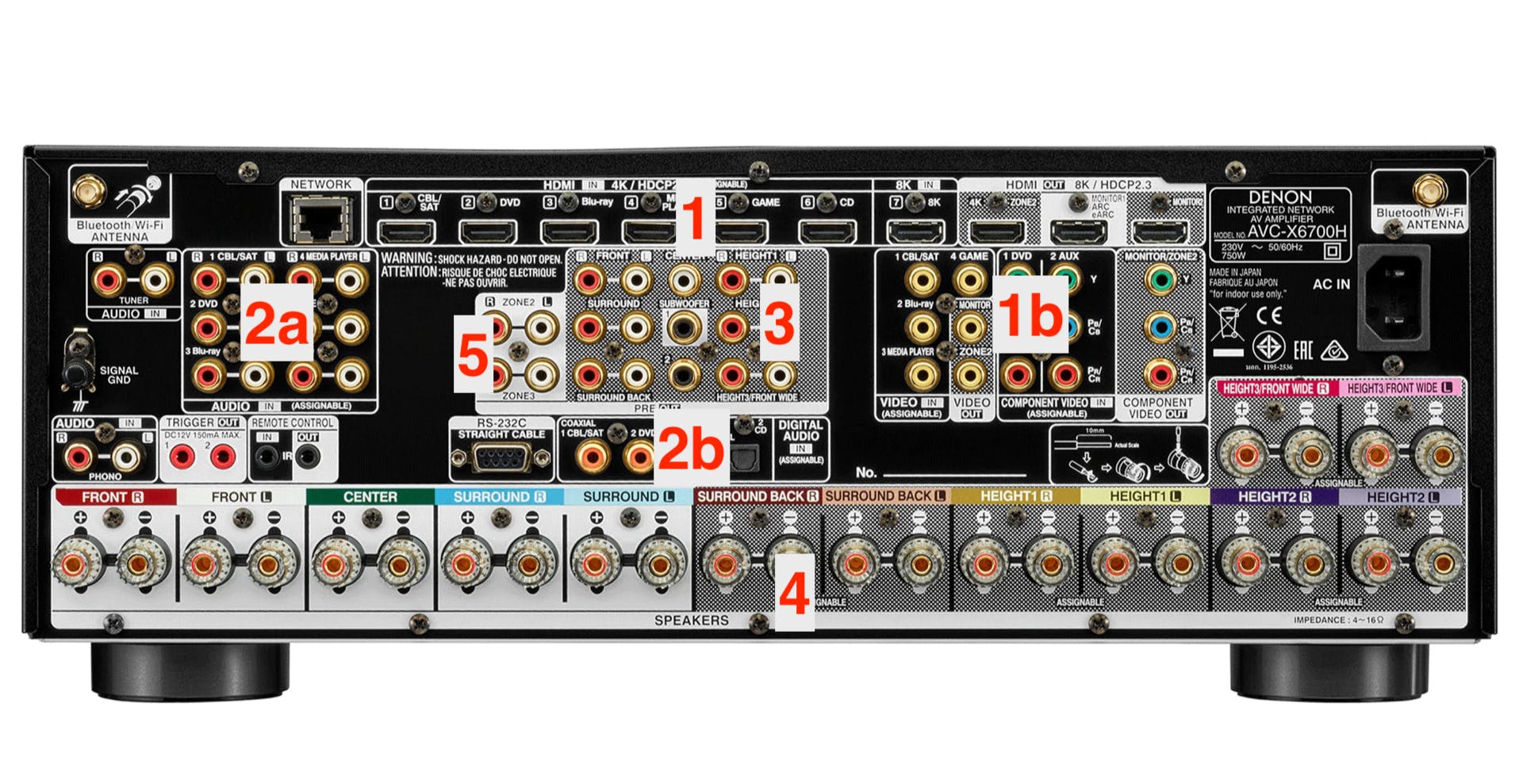 1. HDMI-poorten Op de HDMI-ingangen sluit je videobronnen aan, zoals een gameconsole of een Blu-rayspeler. Dit toestel heeft er zeven. Er net naast vind je één of meerdere HDMI-uitgangen (hier zijn dat er drie). De hoofduitgang sluit je op je tv aan. Op sommige AV-receivers vind je nog oude video-ingangen terug (1b). Best handig als je een retro-console wilt uitproberen.