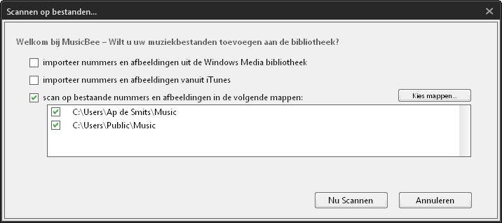 Bij de eerste start wil MusicBee onze muziekverzameling gaan scannen om deze aan de database toe te voegen (Afb.1). MusicBee kan uit de voeten met bestaande bibliotheken van iTunes of Windows Mediaspeler maar wij kiezen voor ‘scan op bestaande nummers’. Als uw muziek zich allemaal in de reeds ingevulde mappen bevindt kunt u die aangevinkt laten. In ons geval halen we de vinkjes weg, klikken we op Kies Mappen en vinken we de mappen aan waar we onze muziek bewaren. Dat mag op het hoogste niveau want MusicBee voegt zelf alles daaronder toe (dus d:\mp3 voegt alle mappen daaronder toe). Tot slot klikken we op Nu Scannen. Afhankelijk van de grootte van de verzameling zal MusicBee enkele tot tientallen minuten bezig zijn waarbij het programma de vordering helaas niet toont (in ons geval zo’n 25 minuten voor 140.000+ tracks). Geduld, dus.