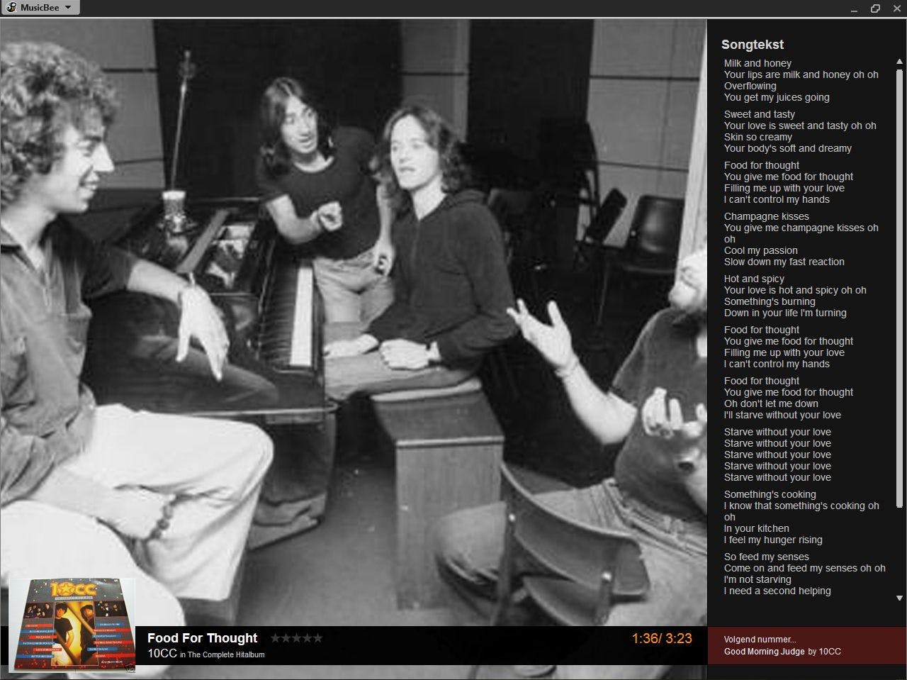 Zoals we tijdens het afspelen kunnen zien probeert MusicBee een albumhoes van internet te halen voor het nummer dat wordt gespeeld (rechtsonder). In dat zelfde schermdeel zien we een tabblad Songtekst. Klikken we daarop dan zal MusicBee proberen de tekst van een nummer op internet te vinden. De informatie die MusicBee ophaalt is helaas niet zo uitgebreid als bij concurrent Jaangle maar het programma kent wel één aardig kunstje. Daarvoor klikken we op de menuknop (MusicBee, linksboven) en kiezen Beeld, Theater Mode, Artist Picture (of de Flickr-variant). De muziek wordt nu gespeeld met (indien vindbaar op internet) een diashow van de betreffende artiest en de songtekst van het spelende nummer (Afb.3). De Theater Mode kunnen we afsluiten met Esc.