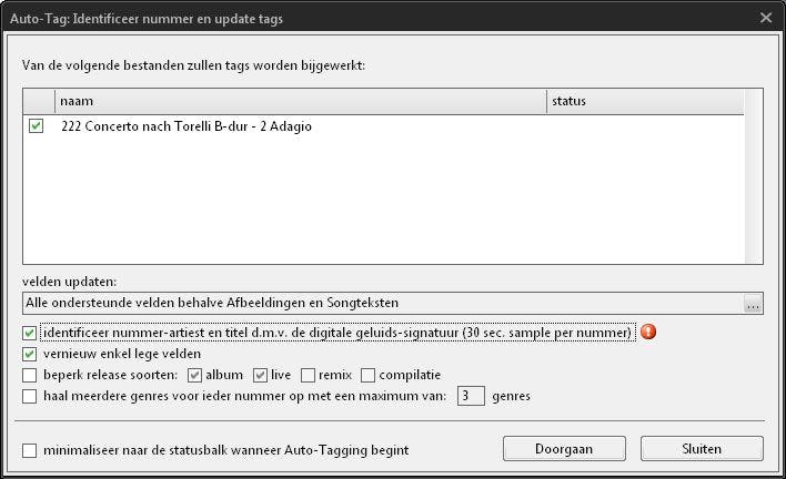 Het daadwerkelijke taggen kan op vele manieren. We selecteren bijvoorbeeld een nummer uit de lijst en rechtsklikken erop. We kunnen dan kiezen voor Autotag per nummer, Nummer identificeren. Klikken we nu op Doorgaan dan worden de tags opgezocht en als ze worden gevonden dan verdwijnt het nummer automatisch uit de lijst met ongetagde nummers. Vindt MusicBee niets dan kunnen we ook nog de optie ‘identificeer nummer…’ aanzetten (Afb.4). Het programma probeert nu het nummer ‘op gehoor’ te herkennen zoals de bekende Shazam-app.