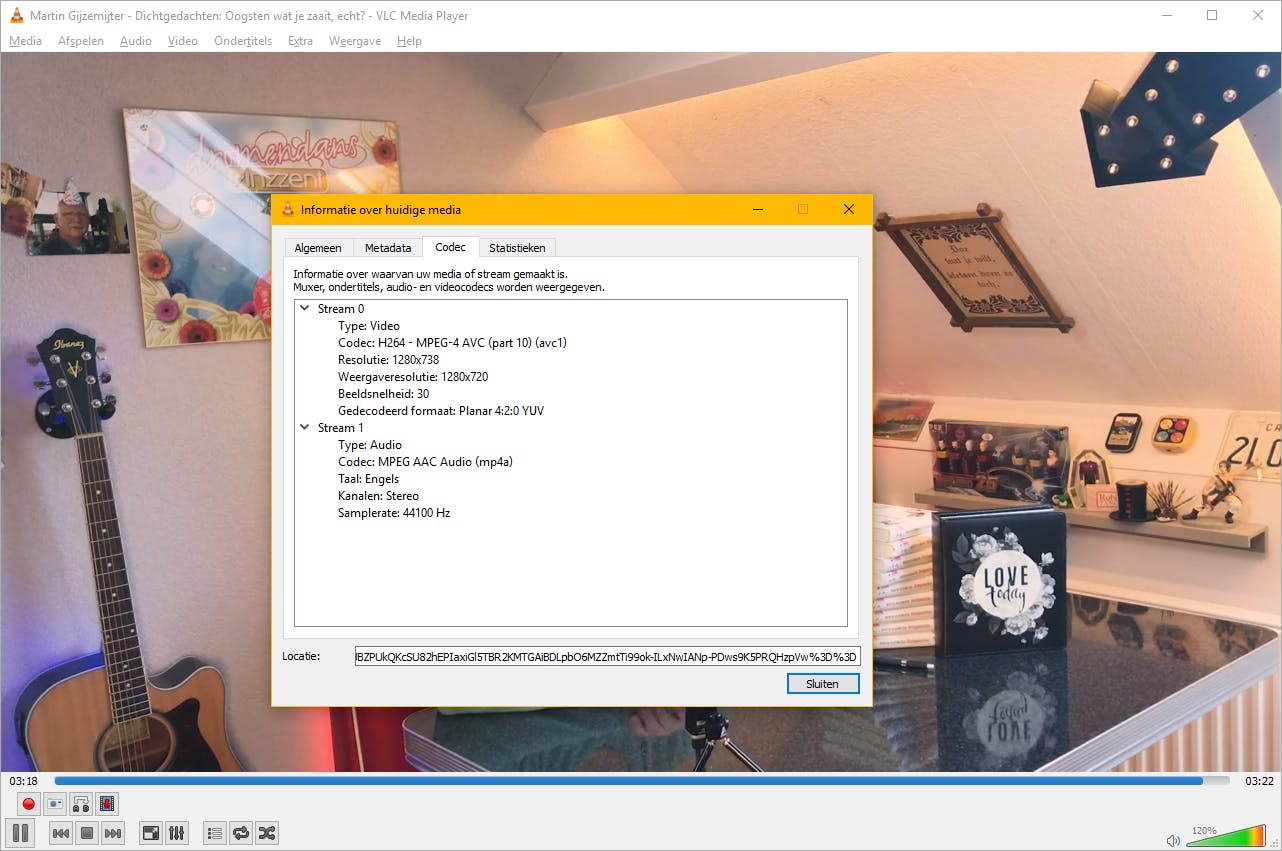 Klik nu bovenin op Extra en vervolgens op Codec-informatie. In het venster dat opent, zie je onderin een veld met de locatie url. Selecteer en kopieer de volledige url en plak deze in het adresveld van je browser. De video zal nu in je browser afspelen. Rechtsklik op de video en klik op Opslaan als. Je kunt de video nu downloaden om later offline te bekijken.
