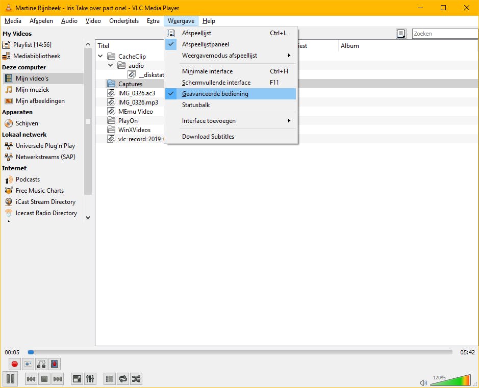 Zorg ervoor dat de video waarvan je de audio wilt opnemen, is ingeladen. Klik dan bovenin op Weergave en vervolgens op Geavanceerde bediening. Een aantal extra knoppen, waaronder een opnameknop, verschijnt onder in het venster. Zodra je op de opnameknop drukt en de video afspeelt, zullen zowel de video als de audio worden vastgelegd op je harde schijf. De video vind jeu terug in de map Video, het audiofragment vind je terug in de map Muziek.