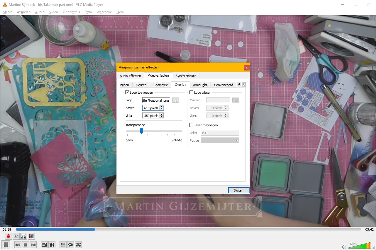 Je hebt het waarschijnlijk al geraden, VLC bevat deze functionaliteit ook. Om een watermerk toe te voegen, open je de video in VLC, waarna je klikt op Extra, Effecten en filters. Bij het tabblad Video-effecten ga je voor het subtabblad Overlay, waarna je een vinkje plaatst bij de optie Logo toevoegen.