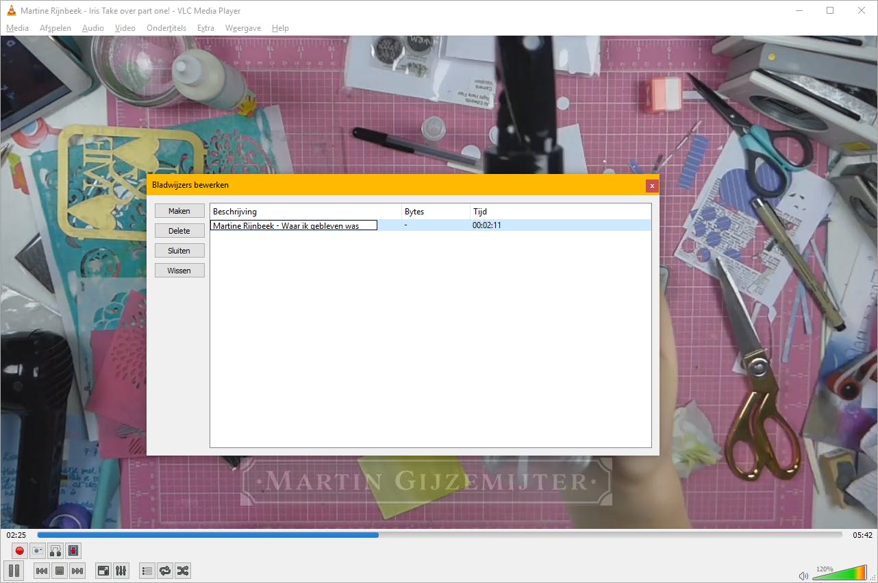Klik dan op de knop Maken en er zal automatisch een bladwijzer aan de video worden toegevoegd. Door te dubbelklikken op de naam van deze bladwijzer (met een korte pauze tussen de eerste en de tweede klik) kun je de naam van de bladwijzer aanpassen. Om zo’n bladwijzer te kunnen gebruiken, open je opnieuw de video en het bladwijzerbeheer (Ctrl+B) en klik je op de bladwijzer die je wilt gebruiken.